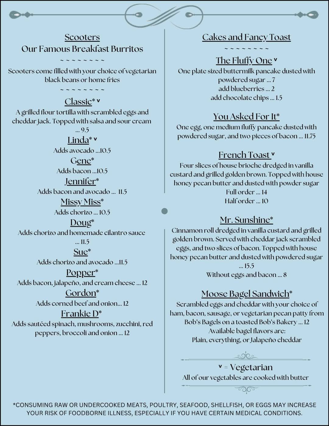 Cinnamon roll dredged in vanilla custard and grilled golden brown. Served with cheddar jack scrambled eggs, and two slices of bacon. Topped with house honey pecan butter and dusted with powdered sugar